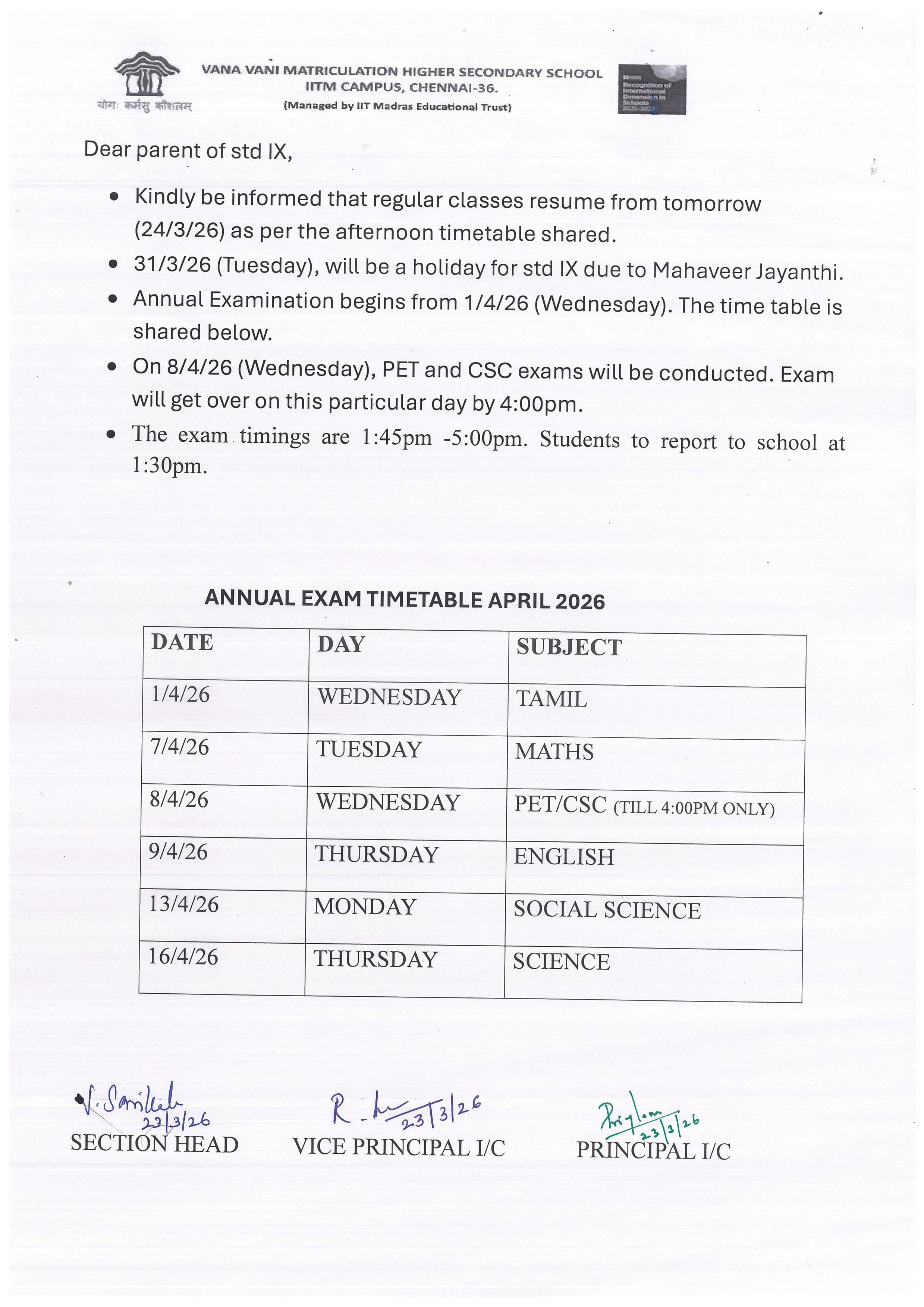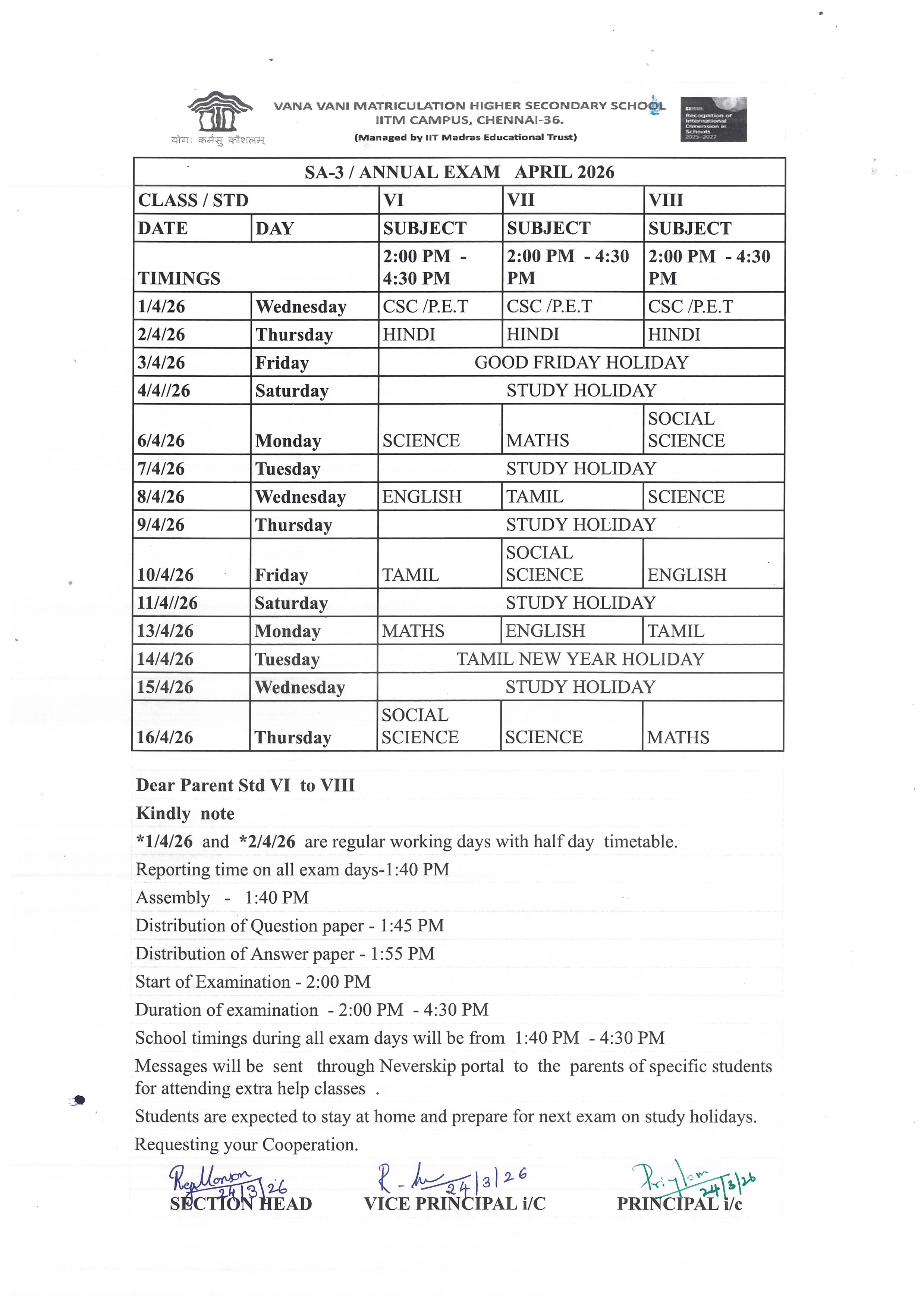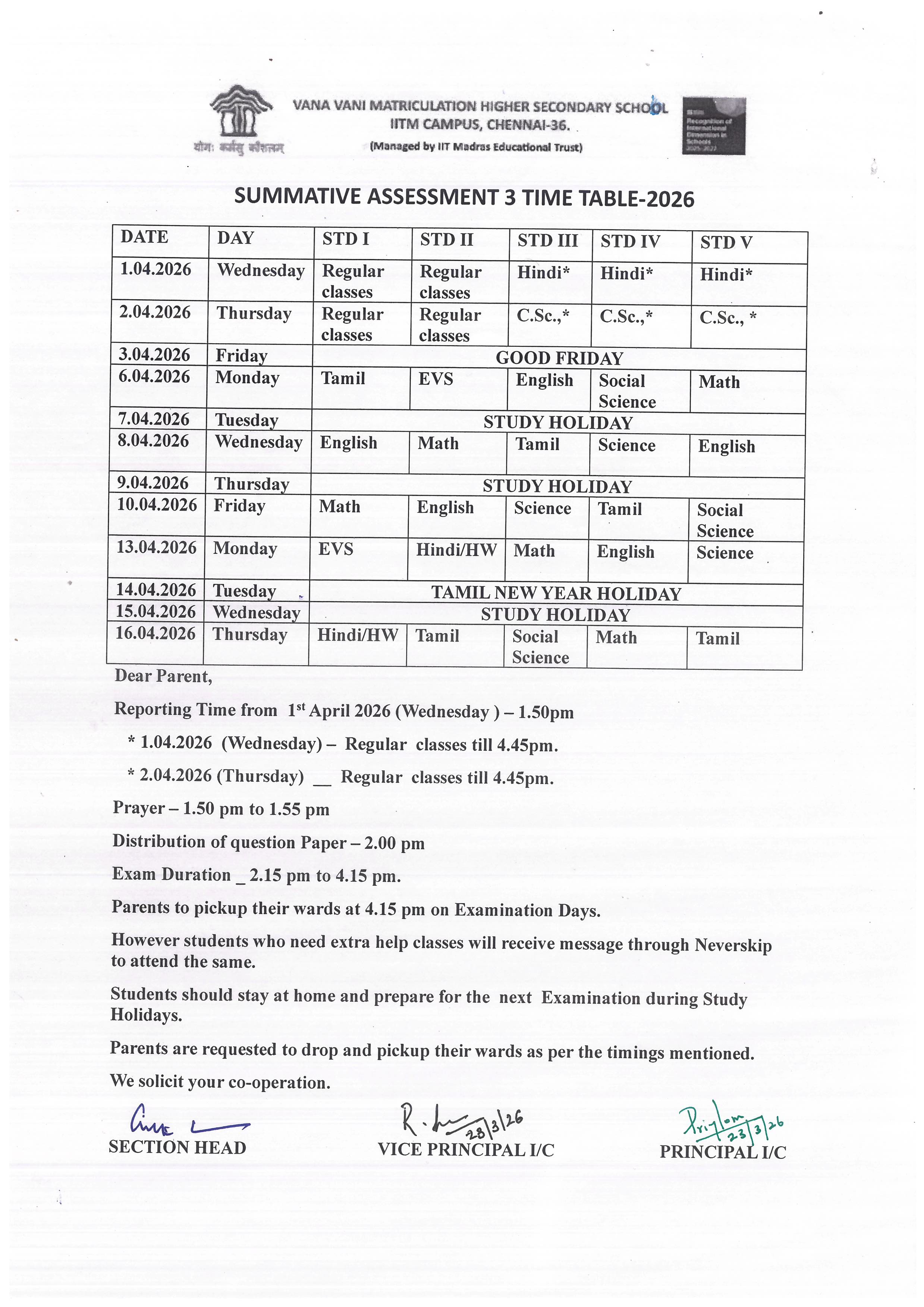 The school prepares its students for the Tamilnadu Board Examination at the end of std. X, std. XI and std. XII