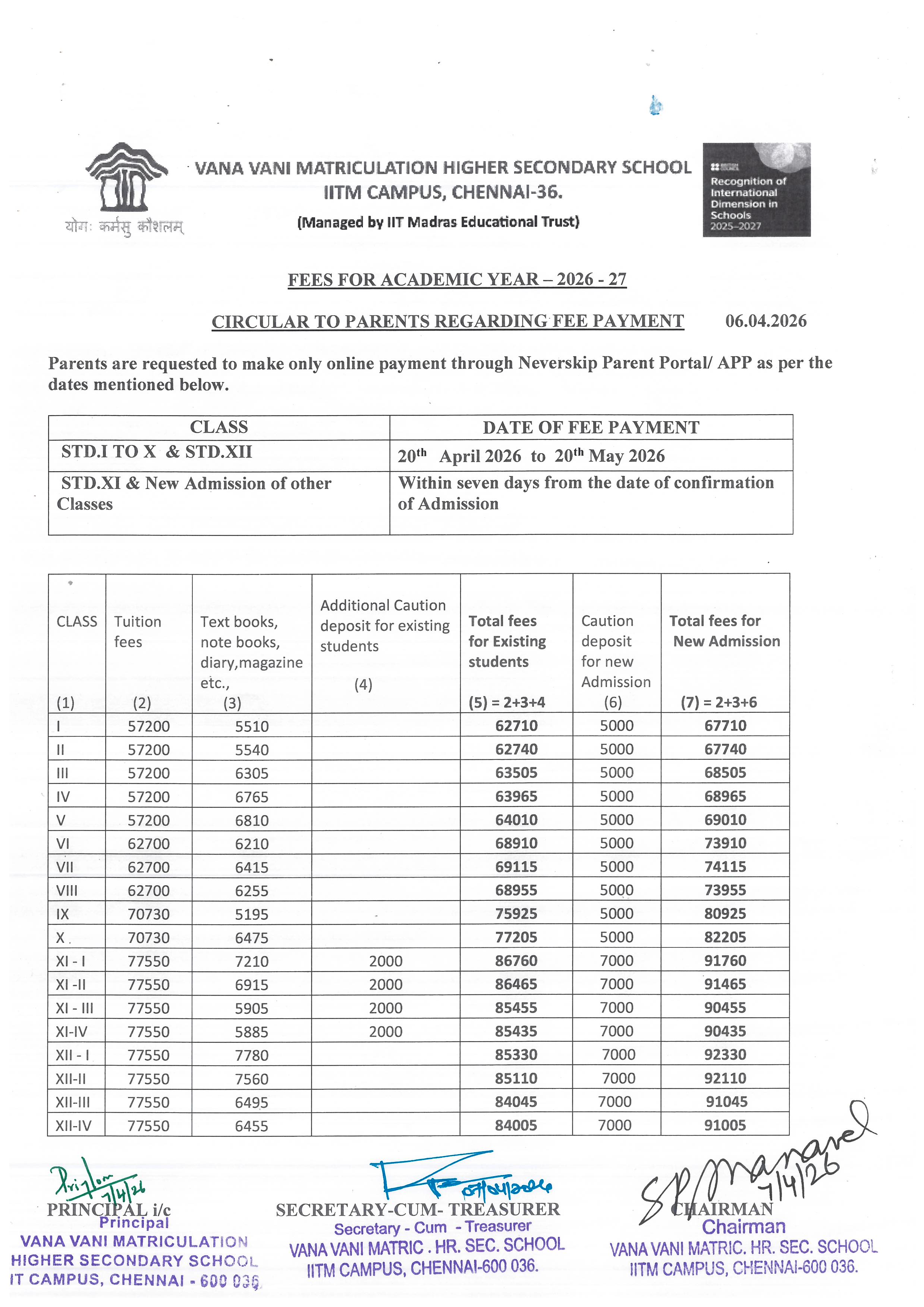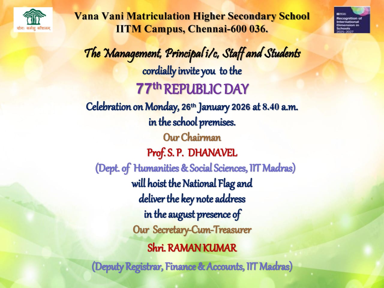 Vana Vani situated in the campus of the Indian Institute of Technology, Madras, was founded on 8th July 1963 as a primary school with 52 pupils. Today it has grown and developed into a fullfledged Matriculation Higher Secondary School with above 2000 boys and girls on the rolls.