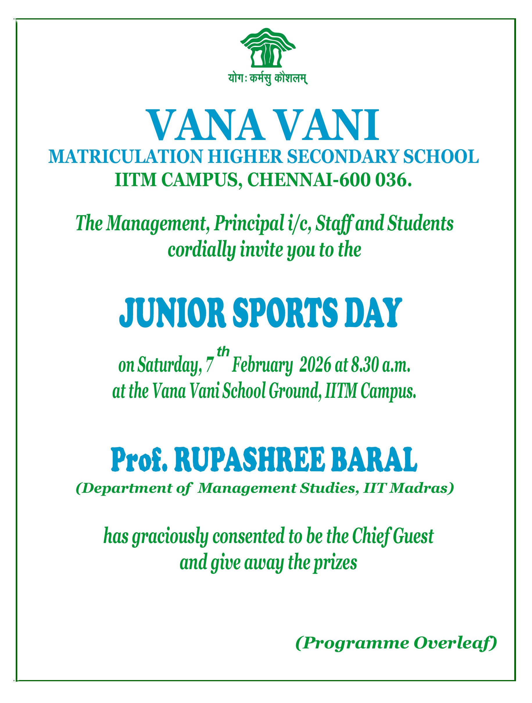 Vana Vani situated in the campus of the Indian Institute of Technology, Madras, was founded on 8th July 1963 as a primary school with 52 pupils. Today it has grown and developed into a fullfledged Matriculation Higher Secondary School with above 2000 boys and girls on the rolls.